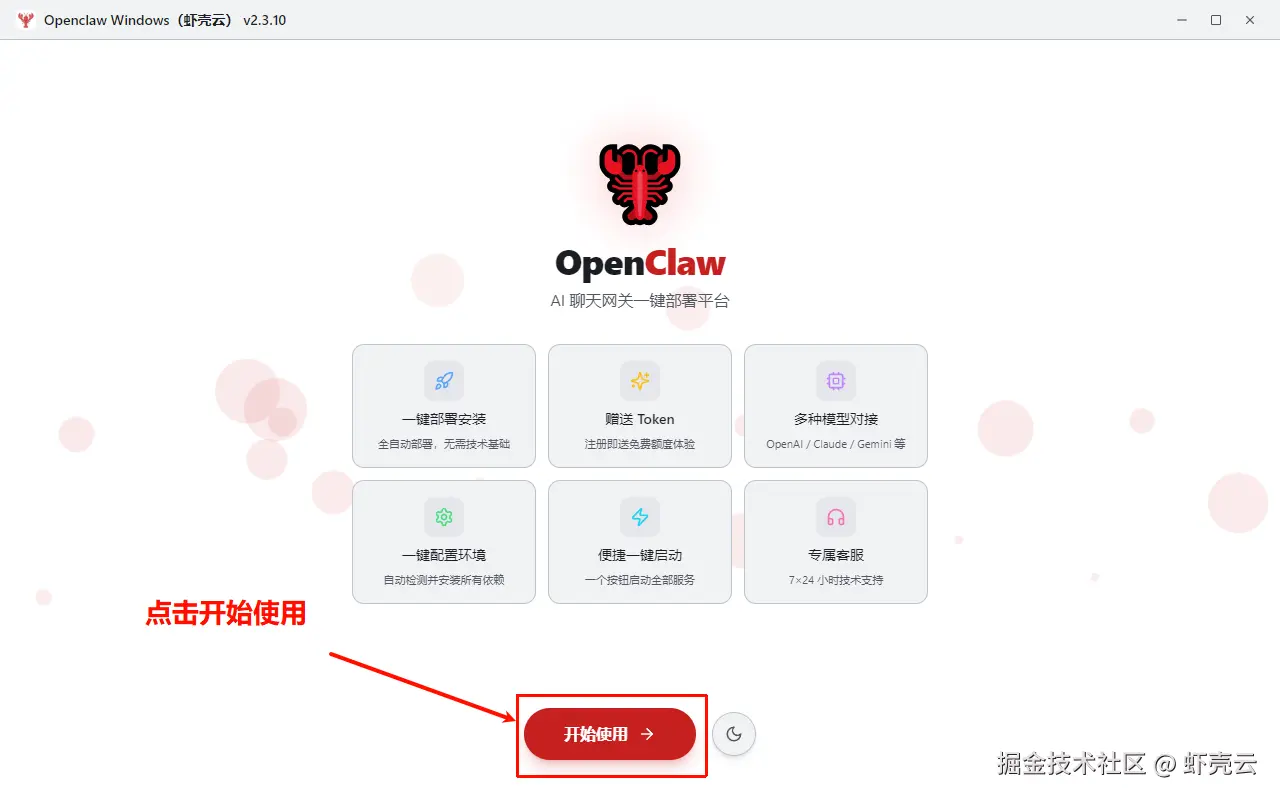 弹出OpenClaw欢迎界面(红色龙虾Logo)后,点击界面底部红色「开始使用」按钮,进入安装配置页面。