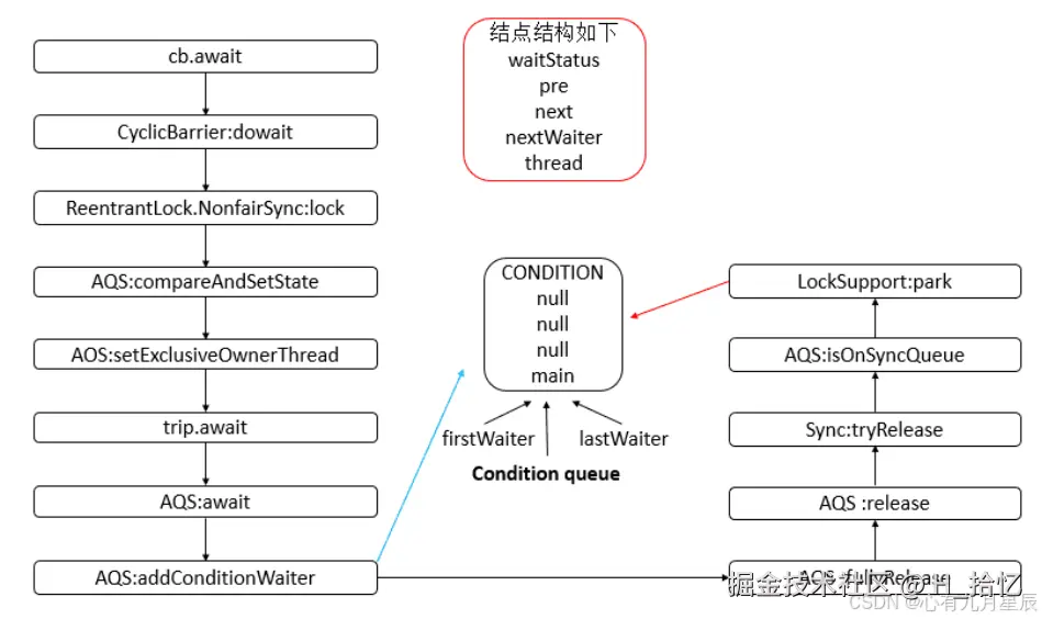t2线程执行cb.await操作,其中假设t2线程的lock.lock操作在t1线程释放了资源之后,则其主要调用的函数如下。