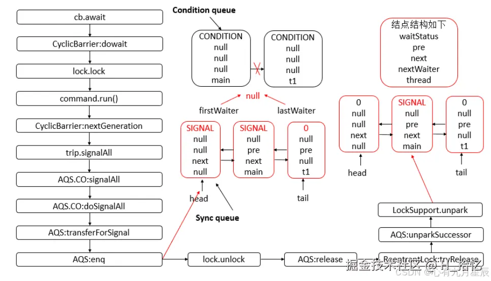 说明: 由上图可知,在t2线程执行await操作后,会直接执行command.run方法,不是重新开启一个线程,而是最后进入屏障的线程执行。同时,会将Condition queue中的所有节点都转移到Sync queue中,并且最后main线程会被unpark,可以继续运行。main线程获取cpu资源,继续运行.