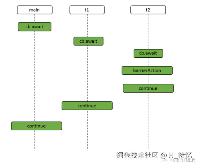 说明: 由上图可知,假设t1线程的cb.await是在main线程的cb.barrierAction动作是由最后一个进入屏障的线程执行的。根据时序图,进一步分析出其内部工作流程。
