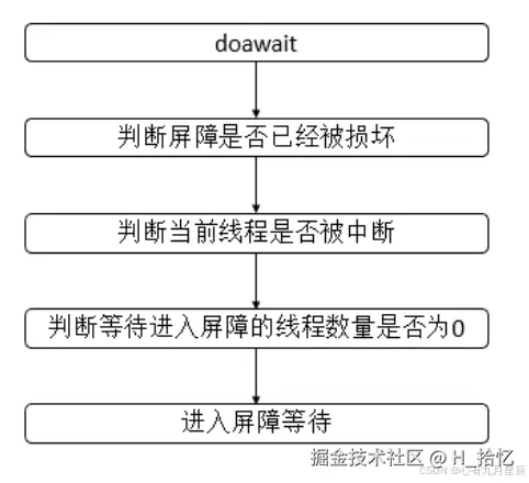 此函数为CyclicBarrier类的核心函数,CyclicBarrier类对外提供的await函数在底层都是调用该了doawait函数,其源代码如下。