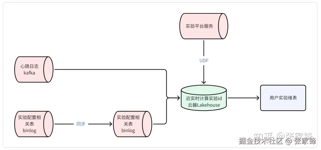 计算一个用户的实验分组只需要两个信息,用户id和实验配置信息,其中只有实验配置信息会实时变化。因此我们将计算实验id的过程封装在了UDF中,使用心跳日志就可以计算出用户当前的实验分组id。计算出来的实验分组信息会存储在云器的用户实验维表中,这样就可以供各种近实时业务使用,而不用重复计算。