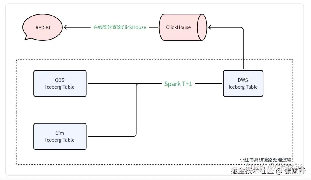 小红书当前的实验数据架构,离线指标和实时指标从属于不同的架构方案,离线指标和实时指标的开发、查询完全分开。其中,离线方案通过ODS入湖,并在 Spark 中通过天级调度进行聚合、关联等操作,将生产的DWS层数据写入到ClickHouse 中,用户通过Clickhouse 进行指标数据的查询。