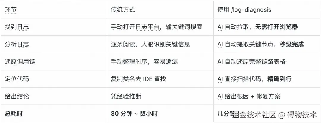 最后说一句:AI 时代,工程师的核心竞争力不只是「能写代码」,更是「能把自己的经验和流程转化成可复用的 AI 能力」。/log-diagnosis 是一次小小的尝试,但背后的思路,值得在更多场景里延伸。