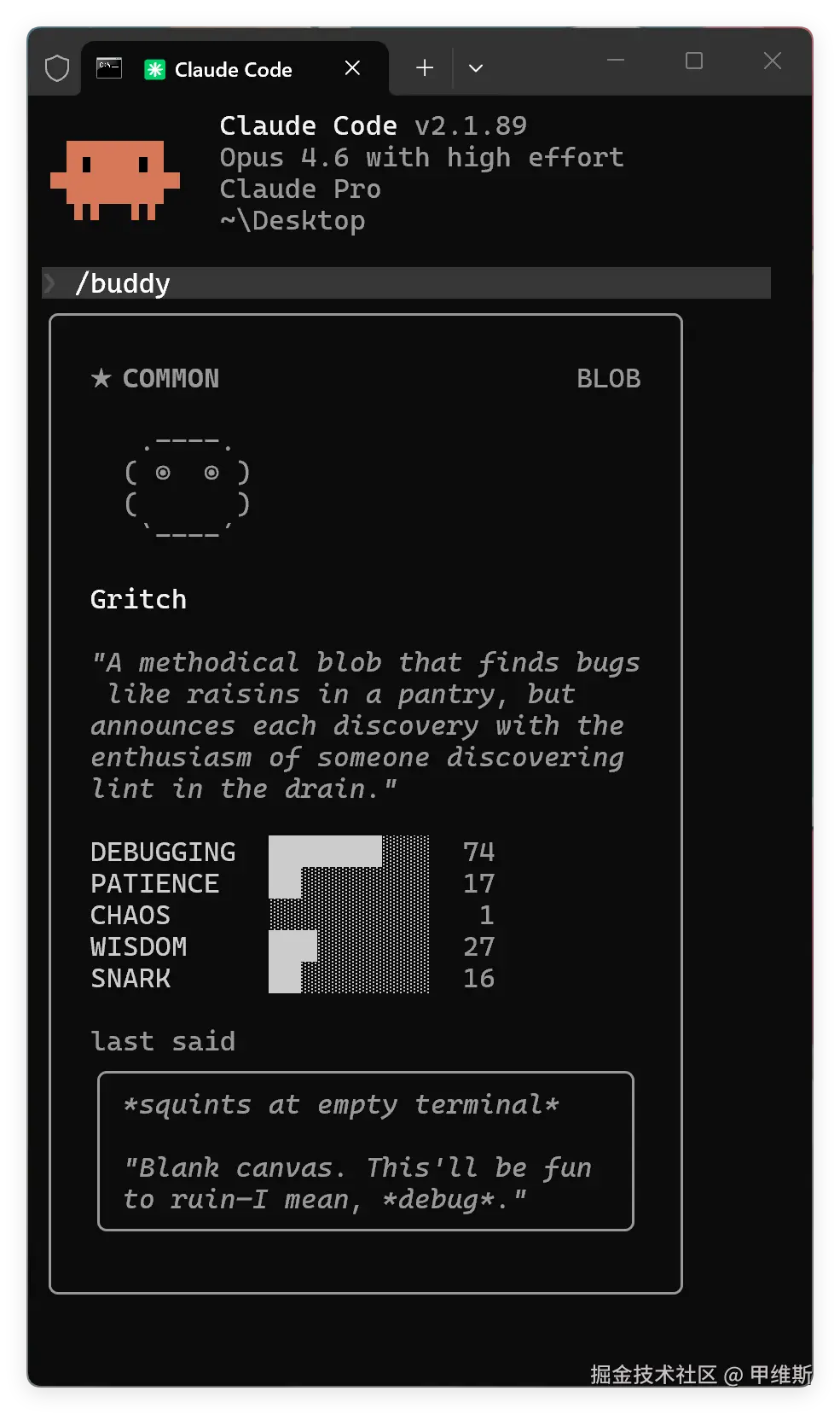 我这个电子宠物叫 Gritch,看长相是个什么物种呢?我好像也看不出来!从属性来看,我这个宠物的核心能力是 DEBUGGING。