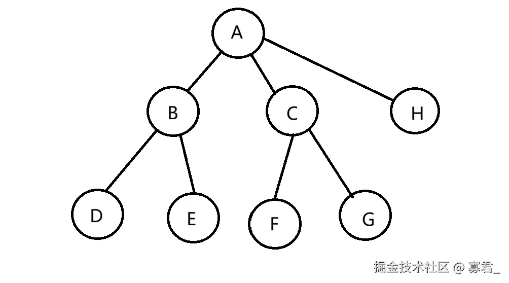 createTree() 方法用于手动构造一棵二叉树。代码中创建了 A、B、C、D、E、F、G、H 八个节点,然后通过给 left 和 right 赋值的方式建立它们之间的父子关系。