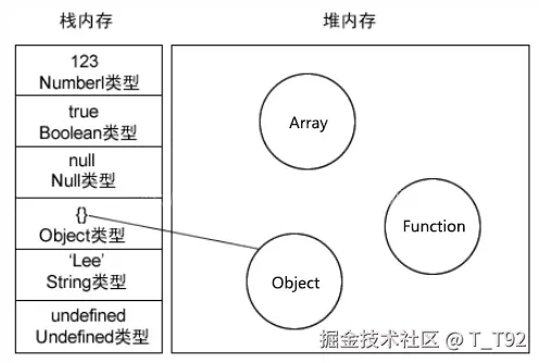 基本数据类型:Undefined,String,Boolean,Null,Number, 都是直接按值存放在栈内存中,占用的内存空间的大小是确定的,并由系统自动分配和自动释放。这样带来的好处就是,内存可以及时得到回收,相对于堆来说,更加容易管理内存空间。