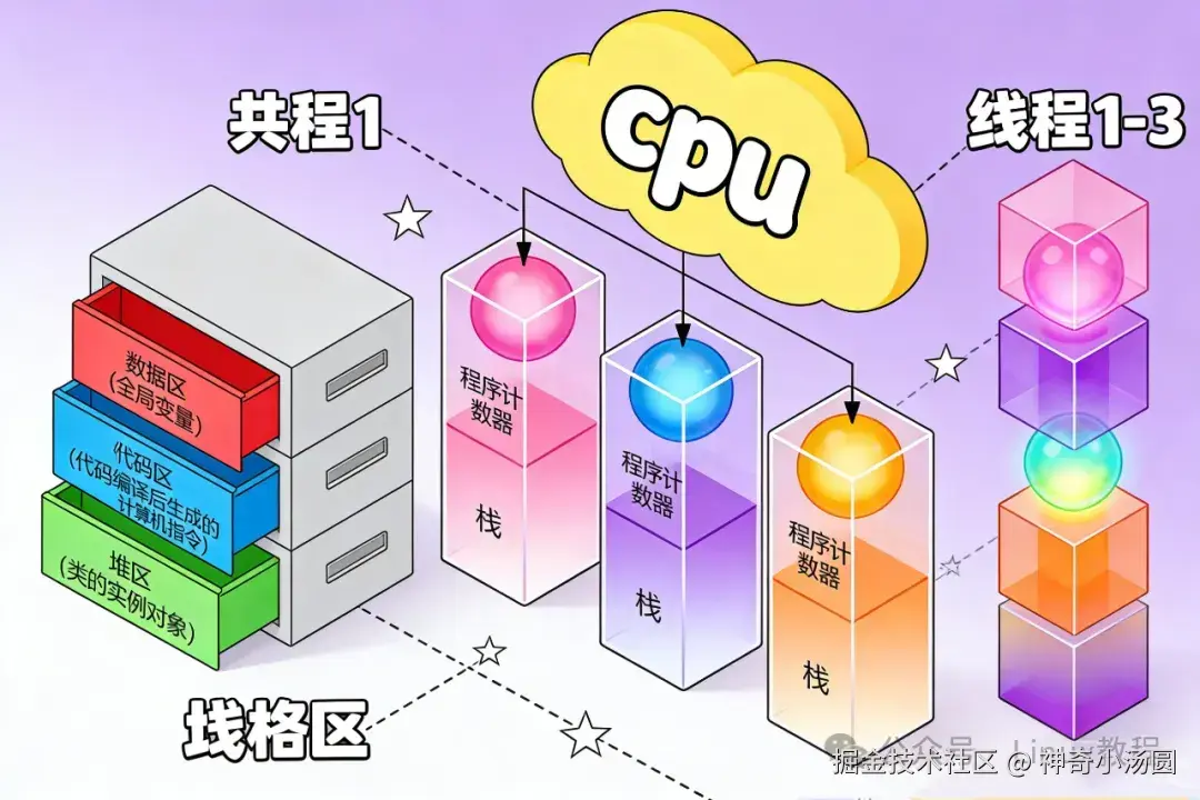 • 线程:同一进程内的线程共享地址空间(共用车间资源),仅私有运行栈和程序计数器(专属操作台和记录本),创建、切换、销毁开销小。