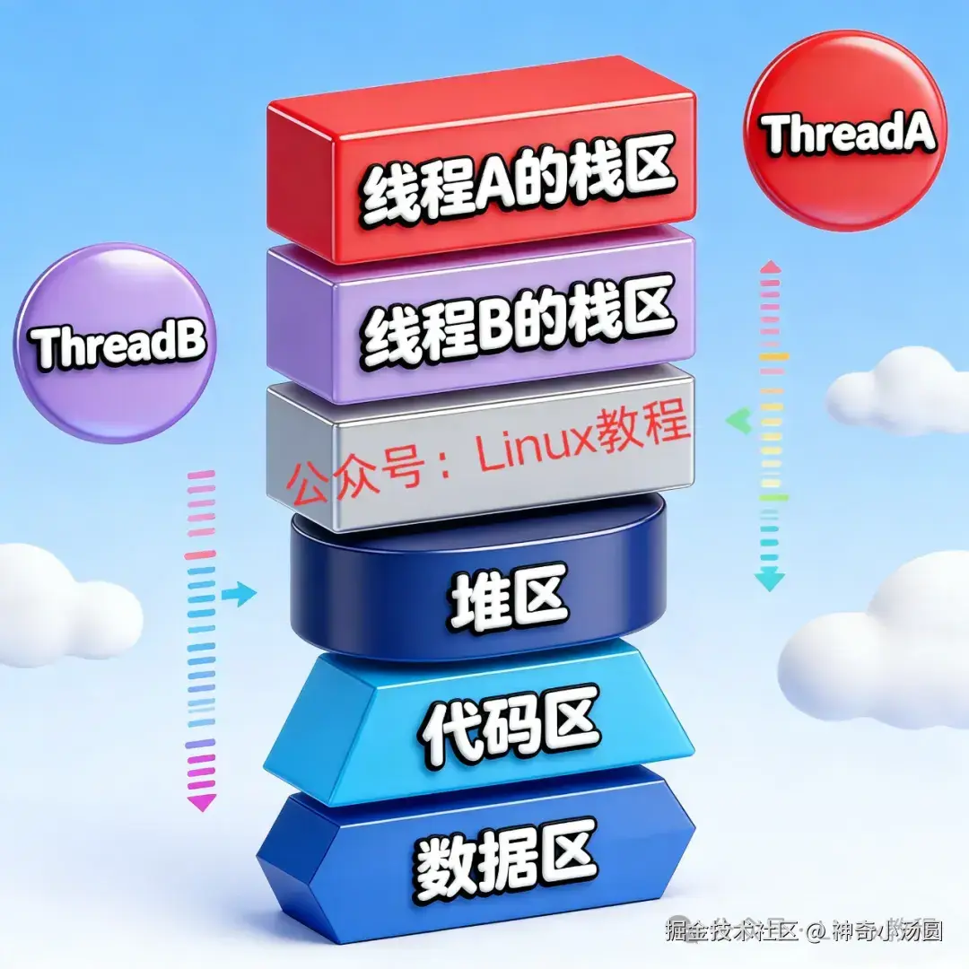 代码区存编译后的机器指令(如thread_func函数),同一进程内的线程可直接调用任意函数 —— 类比所有生产线共用一本 “设计图”,无需单独复印。