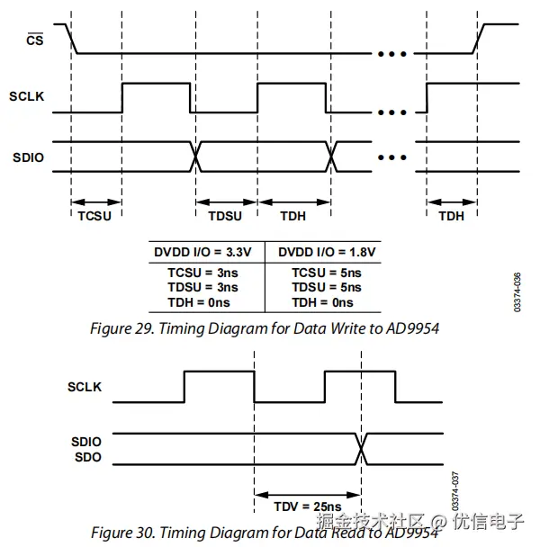 所有输入数据在 SCLK 上升沿采样,输出数据在 SCLK 下降沿更新。相关时序如图 25~图 28 所示。