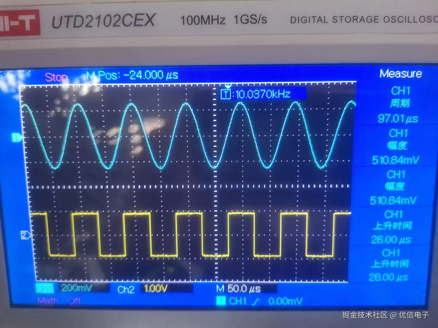 - 输出幅度:正弦波200mVpp,方波1.8Vpp,正弦波随着频率增加幅度减小,方波随着频率增加波 形变化
