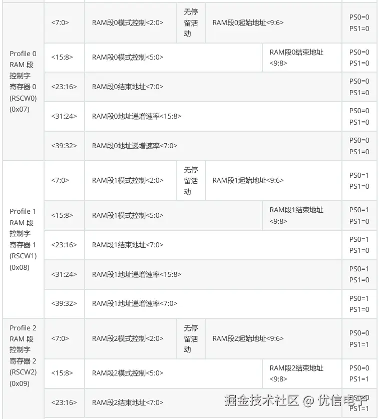 寄存器映射表列于表 12 和表 13 中。当前活动的寄存器映射表取决于线性扫描使能位的状态;根据器件的工作模式,某些寄存器会被重新映射。具体来说,寄存器 0x07、寄存器 0x08、寄存器 0x09 和寄存器 0x0A 会受到影响。由于线性扫描操作的优先级高于 RAM 操作,Analog Devices 公司建议,当使用位 CFR1<21> 启用线性扫描时,应使用位 CFR1<31> 禁用 RAM,以节省功耗。每个寄存器的序列地址采用十六进制格式。尖括号 <> 用于引用特定位或位范围。例如,<3> 表示位 3,<7:3> 表示从位 7 到位 3(含位 7 和位 3)的位范围。注意,RAM使能位CFR1<31>仅激活RAM本身,并不激活RAM段控制字。