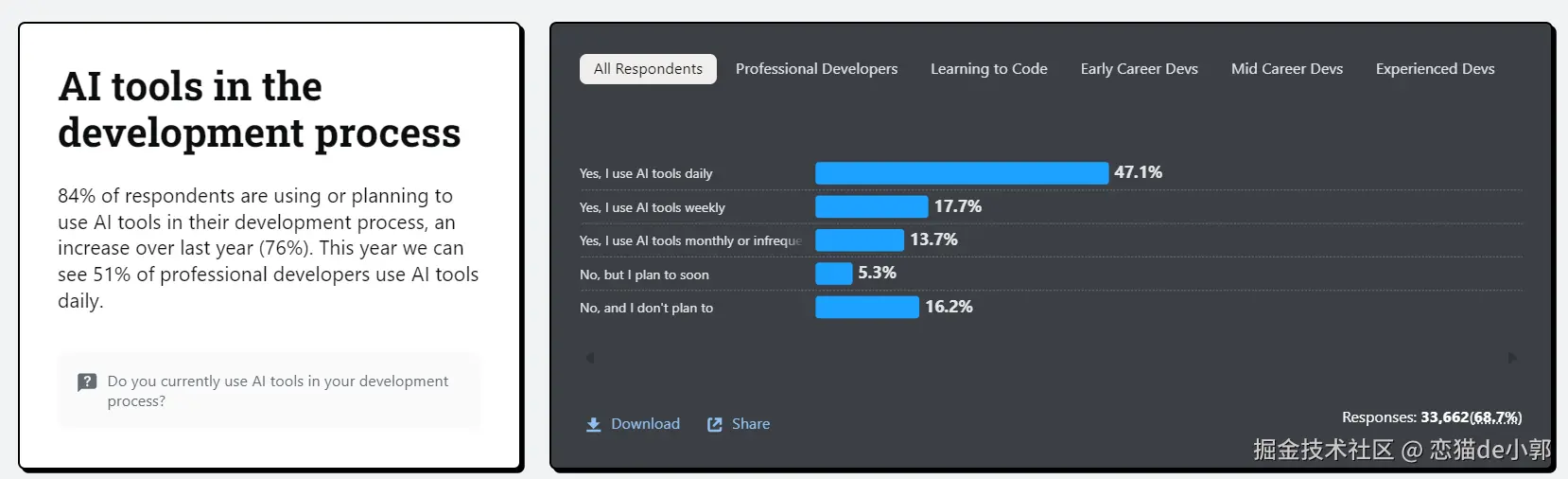- 2025 Stack Overflow 开发者调查里,84% 的开发者在日常工作流程中以某种方式使用 AI 工具