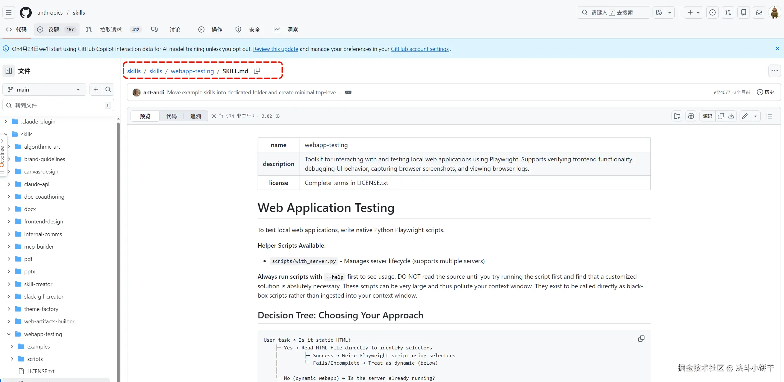 Webapp Testing Skill是Anthropic官方推出的Web应用测试工具,有了这个 Skill,你只需要告诉 AI “测试登录功能”或者“验证表单提交流程”,它就能自动完成测试。