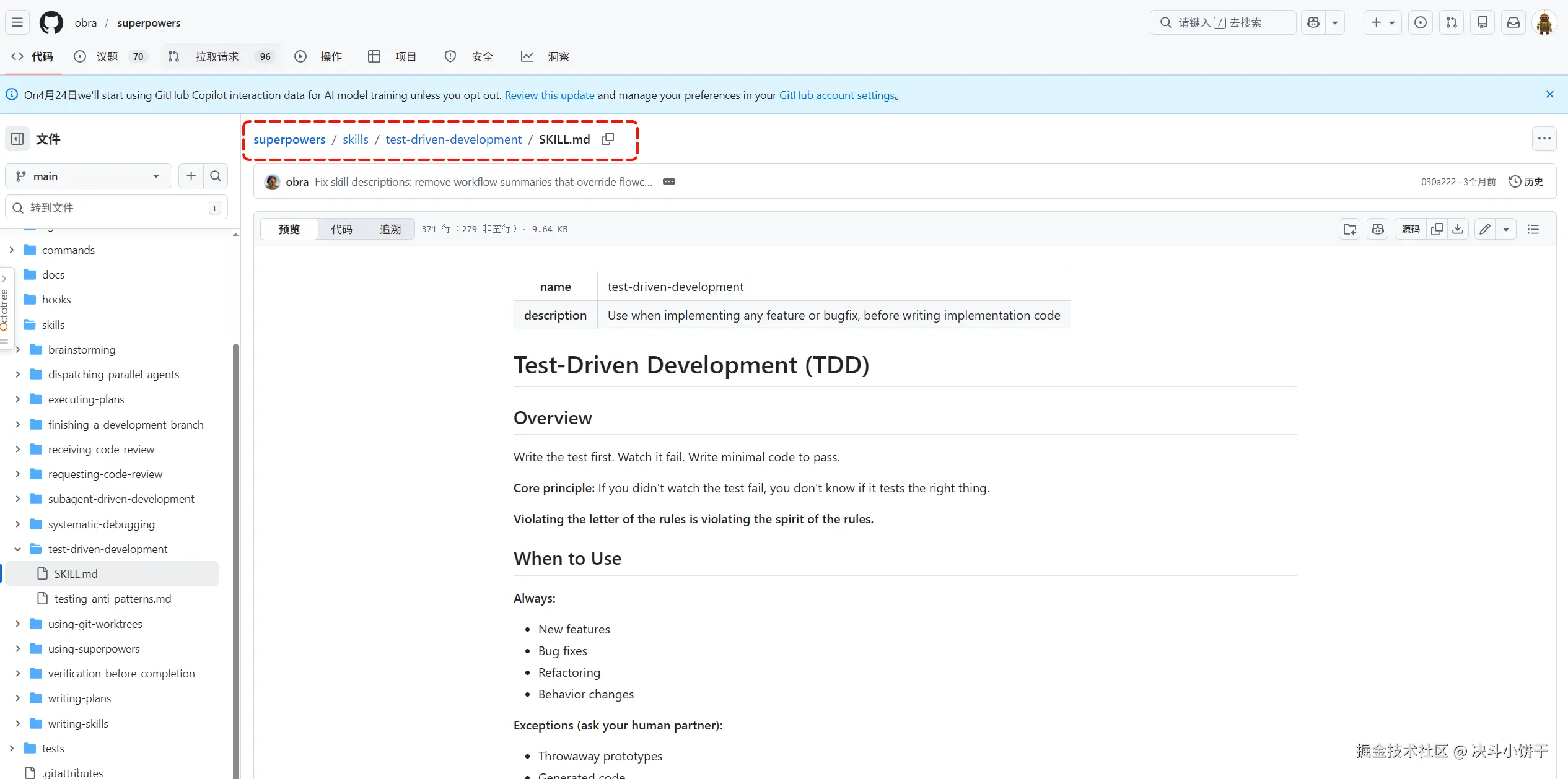 而这款TDD Skill是来自obra的Superpowers技能库,解决"AI写代码很快,但写测试很慢(或者直接跳过)"的问题。