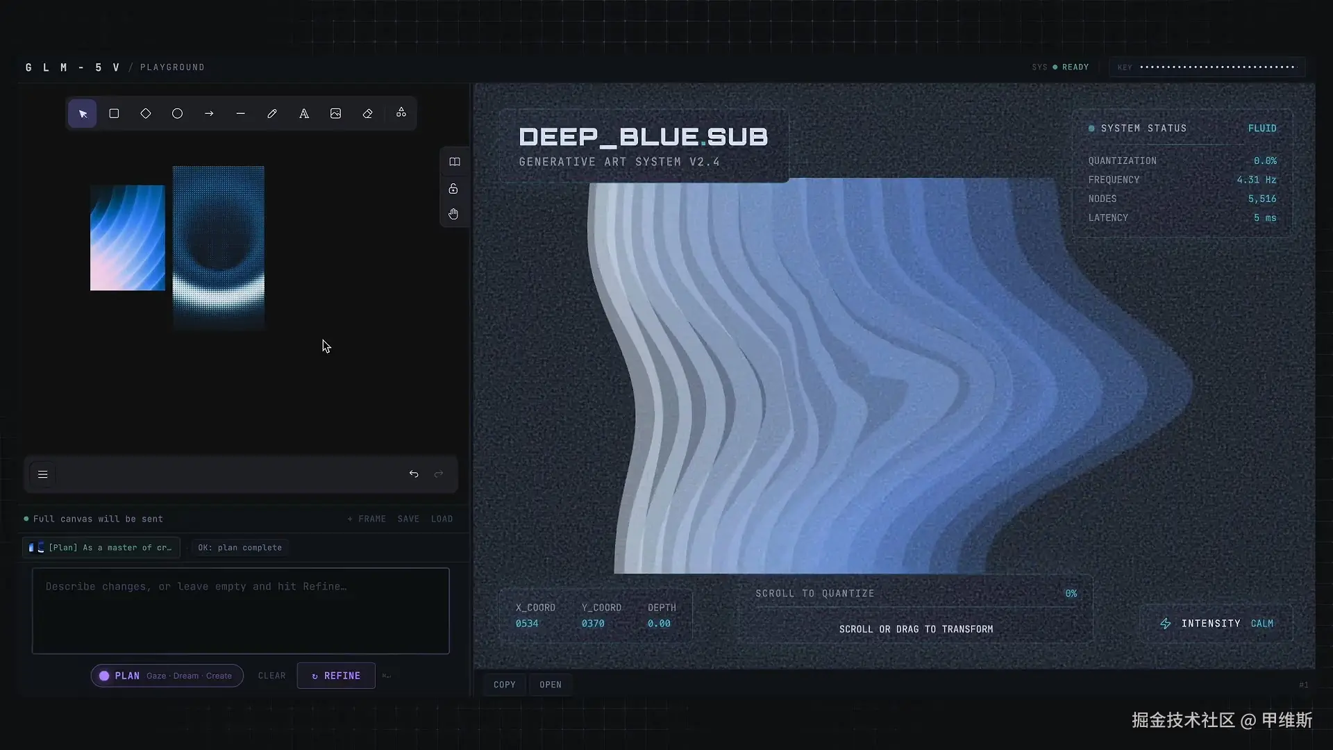 As a master of creative programming, create an interactive generative art piece with given reference image as direction/inspiration. You may use canvas2d, shader, p5.js or similar. 作为创意编程大师,以给定的参考图像为方向/灵感,创作一件交互式生成艺术作品。你可以使用 canvas2d、着色器、p5.js 或类似工具。