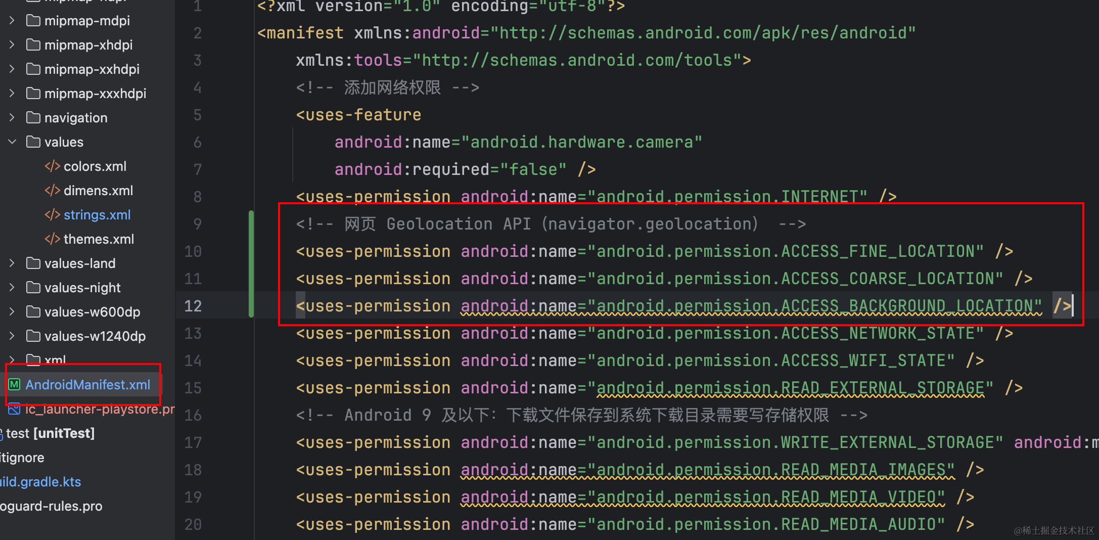在 Kotlin 开发的 Android 应用中,让 WebView 正常使用 H5 页面的定位(navigator.geolocation),核心是权限配置 + WebView 设置 + WebChromeClient 回调三部分。下面是完整可直接使用的实现方案。