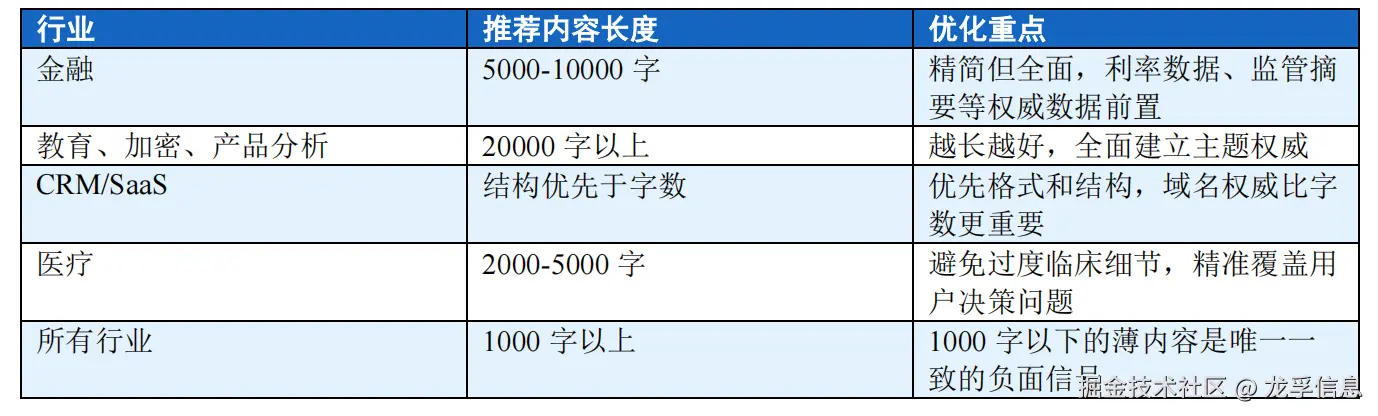 金融行业是一个特例。高引用的金融页面平均只有 1783 字,远低于低引用页面(2084 字)。金融机构应聚焦于精简的权威数据(如利率表、监管摘要)并将其绝对前置到页面的前30%,而非追求字数堆砌。