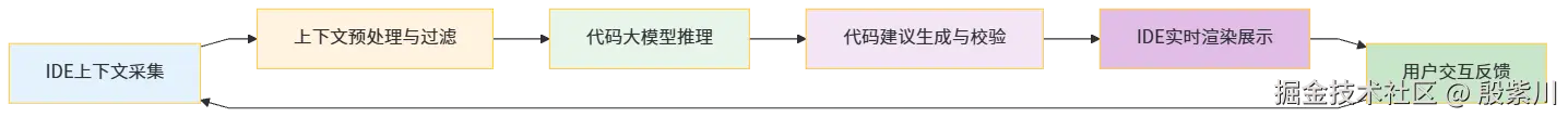 - 模型推理:将处理后的上下文传入代码大模型,基于海量开源代码训练数据与语义理解能力,生成符合语境的代码逻辑