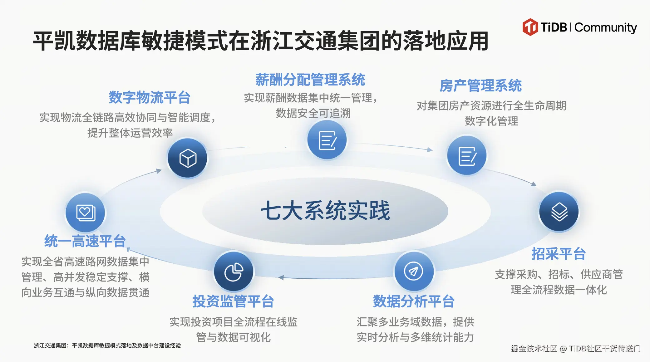 平凯数据库敏捷模式已落地浙江交通集团七大系统,覆盖交通运营、供应链、人力资源、国资监管等关键领域,以技术底座能力驱动业务价值升级:
