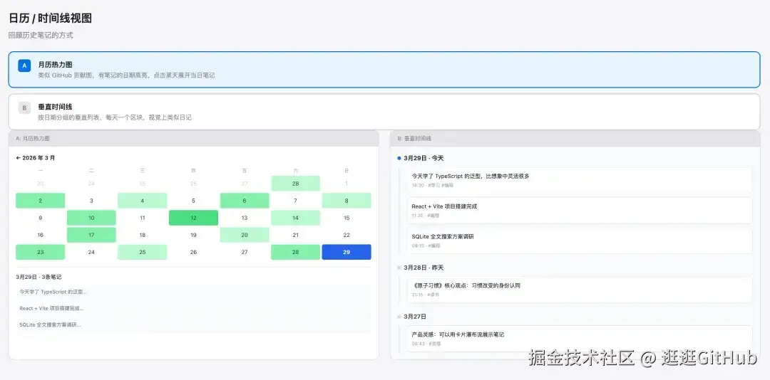创建/编辑/删除笔记、标签自动解析、全文搜索、日历视图、CLI 操作等。