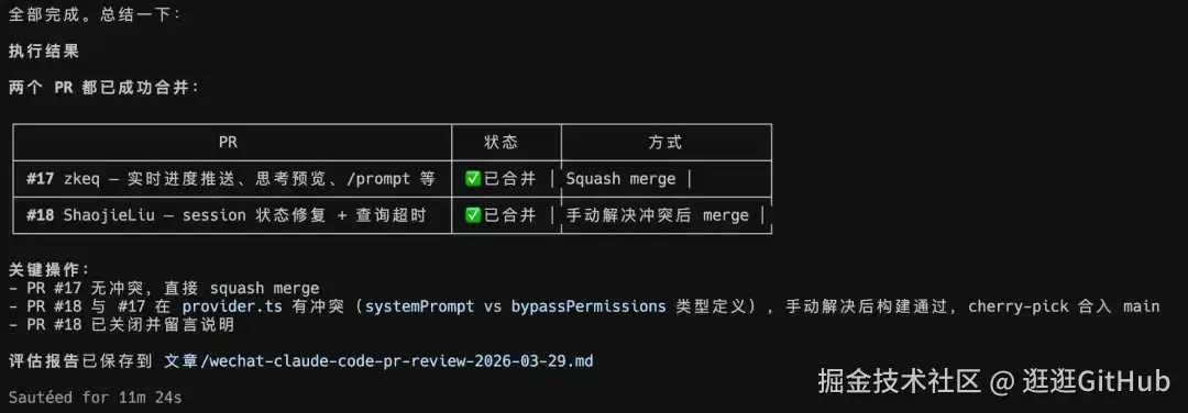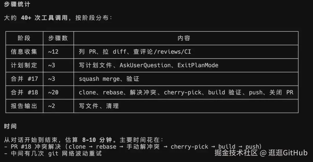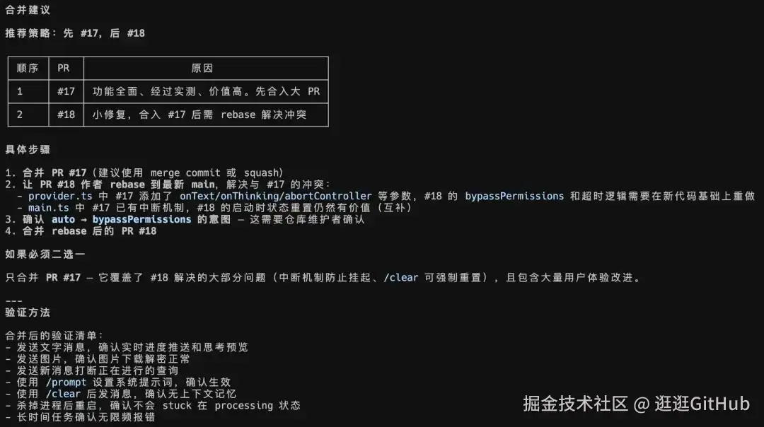 听起来不复杂,但实际操作链路很长:遍历 PR、逐条评估、冲突解决等等,需要输出一份完整的执行计划。