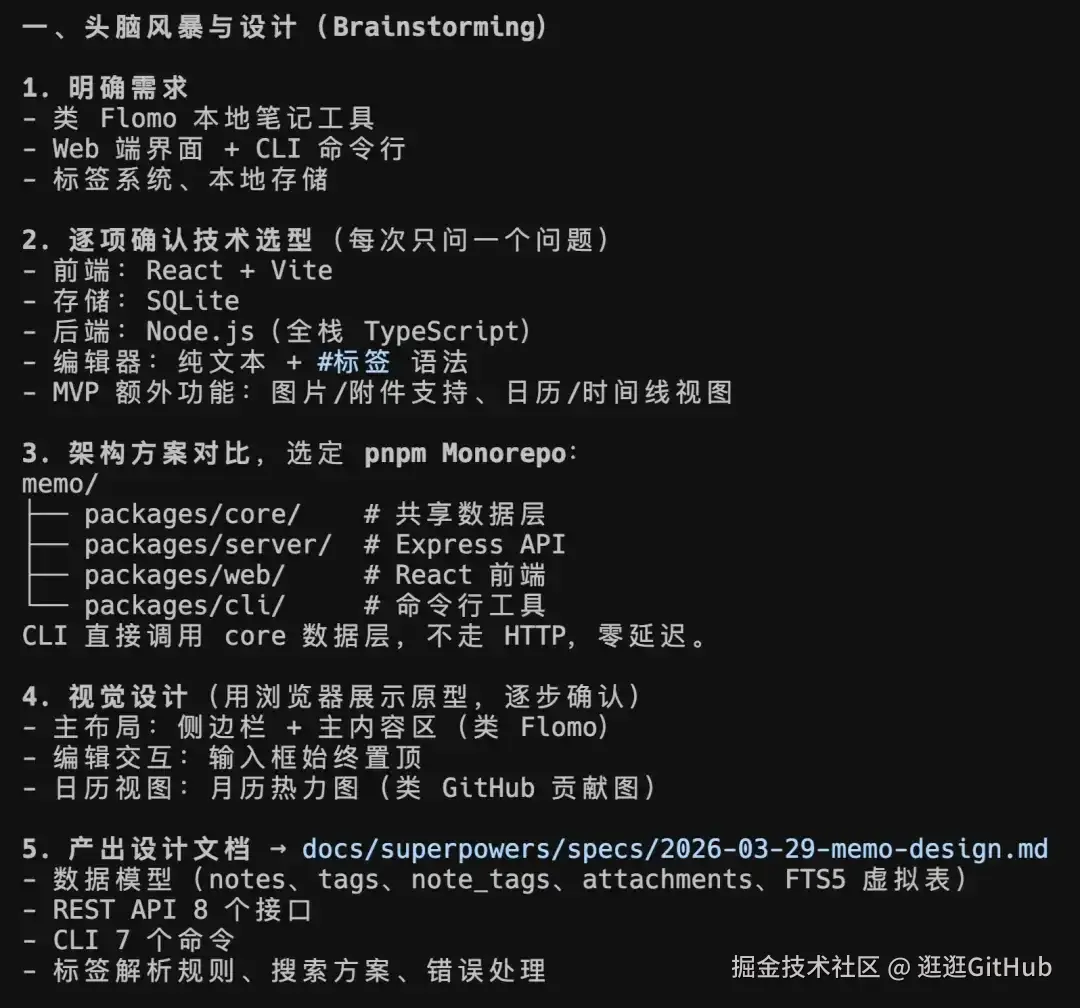 比如我先使用 brainstorming 进行前置讨论,确定需求范围、技术选型、实现方式等一系列重要的事儿。