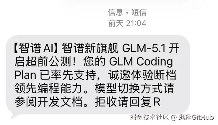 就收到一条短信,智谱 Coding Plan 支持 GLM-5.1 模型了。