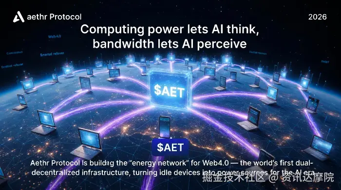 2026年3月,总部位于美国特拉华州的 Web4.0 基础设施项目 Aethr Protocol 正式面向全球发布其技术架构与经济模型。项目提出“算力让 AI 思考,带宽让 AI 感知”的核心理念,通过构建去中心化的双资源网络,将全球数十亿台闲置设备(PC、手机、宽带)转化为 AI 智能体可调用的“数字能源”,并让贡献者获得 $AET 代币奖励。