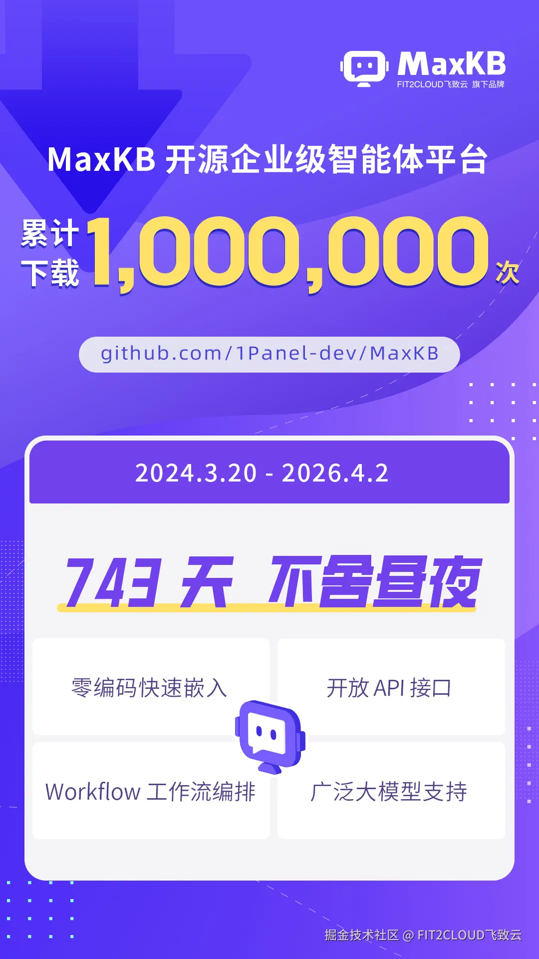 喜报丨MaxKB开源企业级智能体平台全网累计下载数量突破100万次! FIT2CLOUD飞致云 2026-04-02 0 阅读1分钟 截至2026年4月2日10:00,飞致云旗下开源项目——MaxKB开源企业级智能体平台全网累计下载数量突破100万次!继Halo、1Panel后,MaxKB成为飞致云旗下第三个全网累计下载数量突破100万次的开源项目。