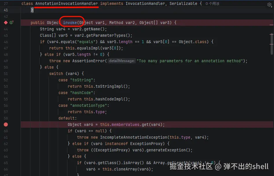 如果是真的挖链,就是一步一步试错加上对 Java 的熟悉程度。这里直接跳到结论——最终找到的是 AnnotationInvocationHandler.invoke()。