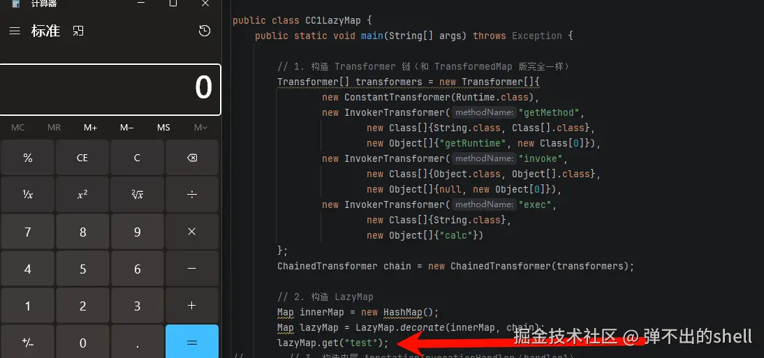 只要 get() 时传入一个 map 里不存在的 key,就会自动调用 factory.transform(key)。如果 factory 是我们的 ChainedTransformer,命令就执行了。