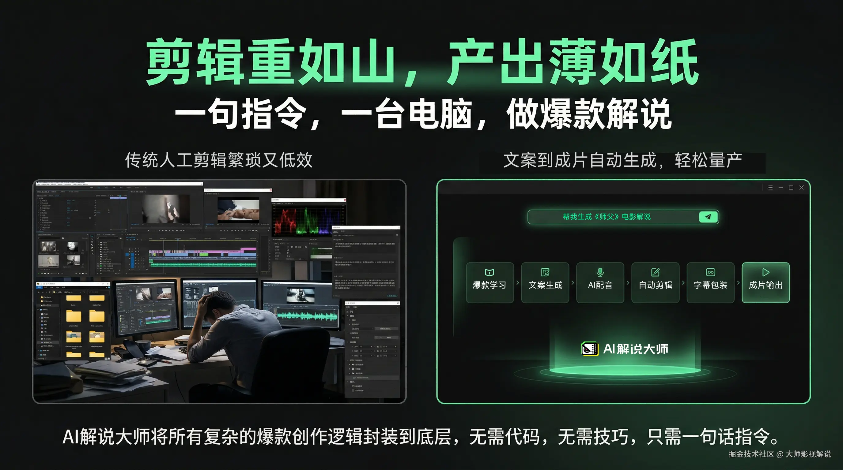 一条三分钟的解说视频,背后是大半天的连轴转。素材在多个软件之间导来导去,更残酷的是,这些事情不会因为你做得多就变快。
