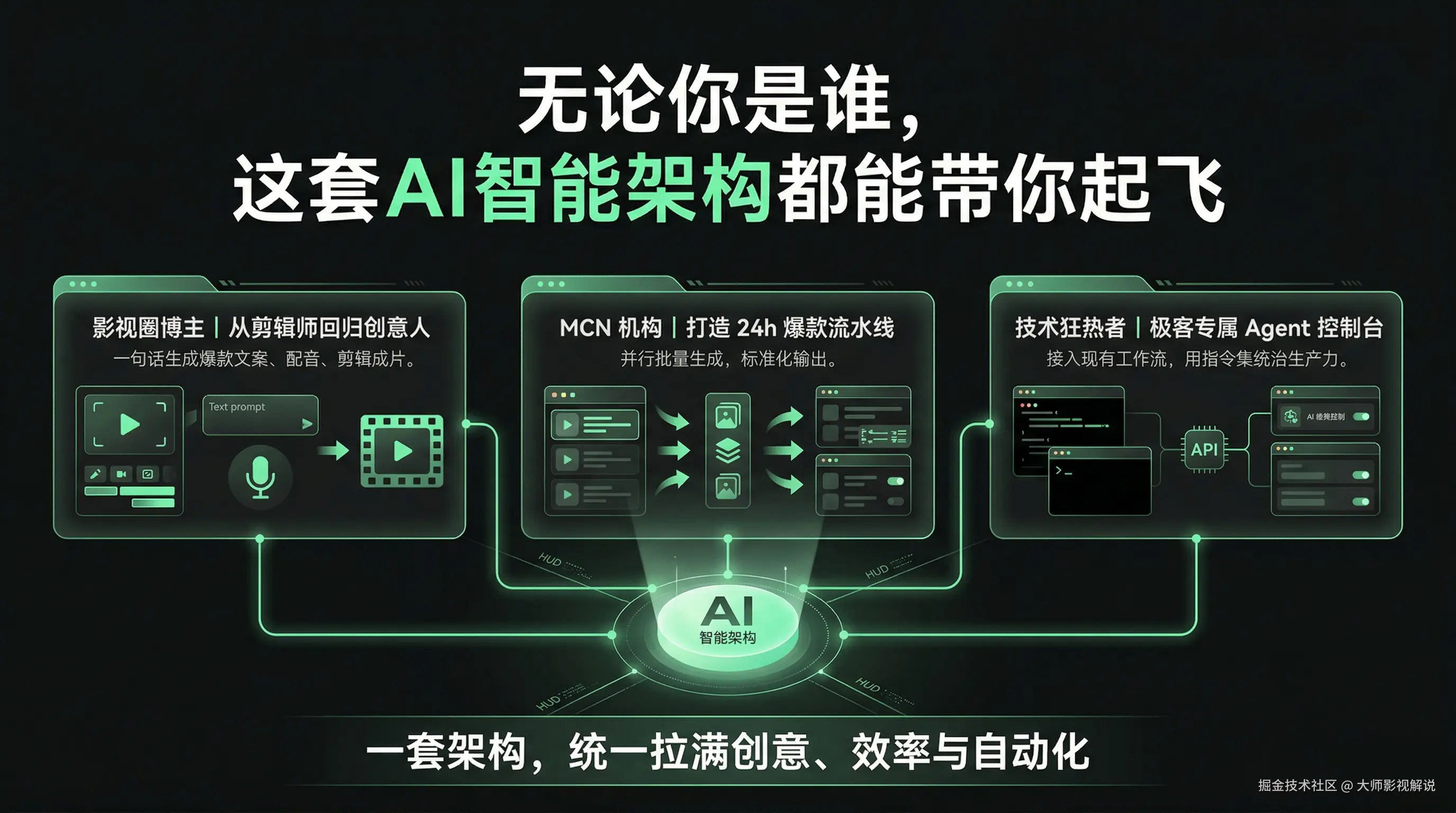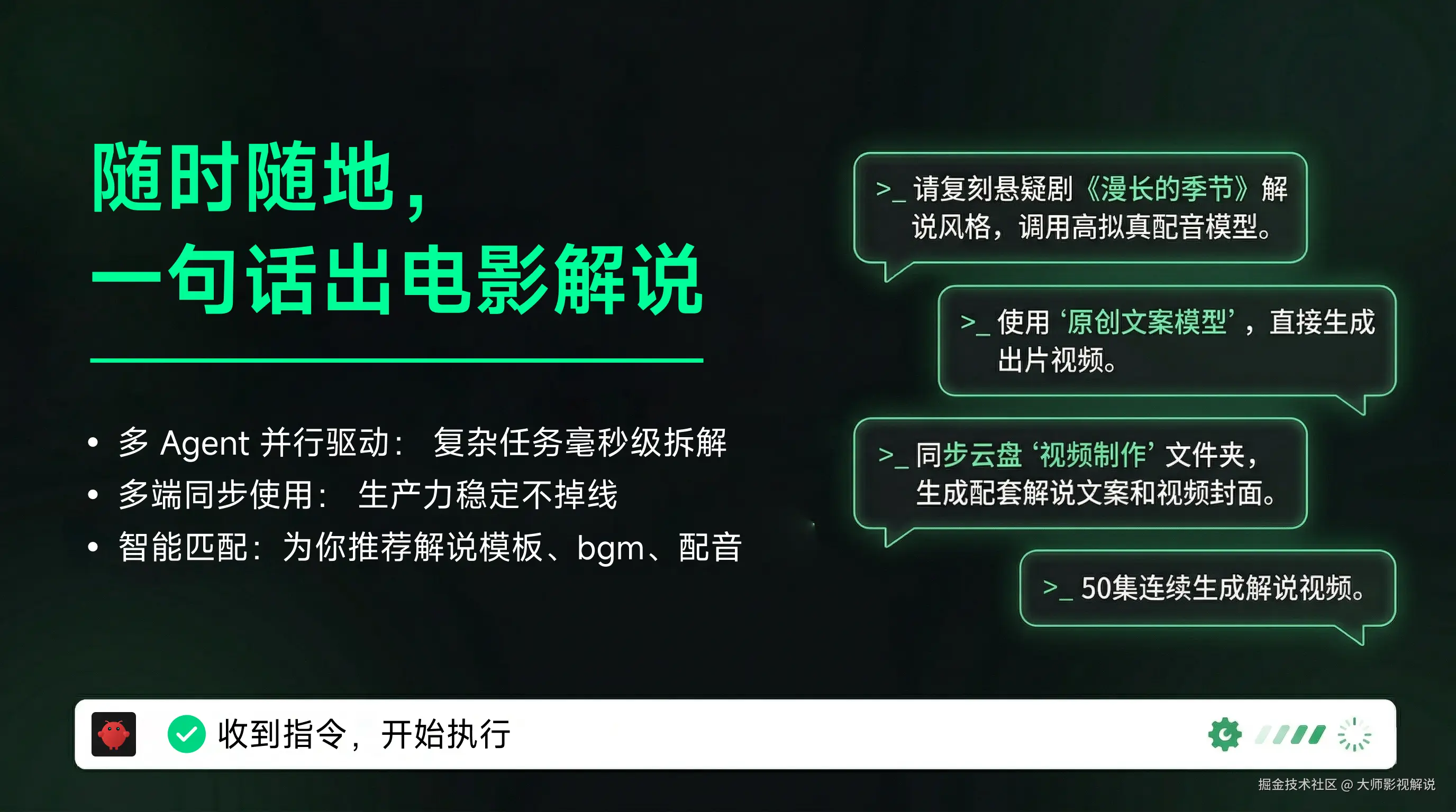 你不需要会剪辑,不需要懂代码,甚至不需要打开任何软件界面。早上通勤的时候在对话框里打一句话,AI自动帮你从文案写作到成片输出,全链路搞定,到公司成片已经在等你了。