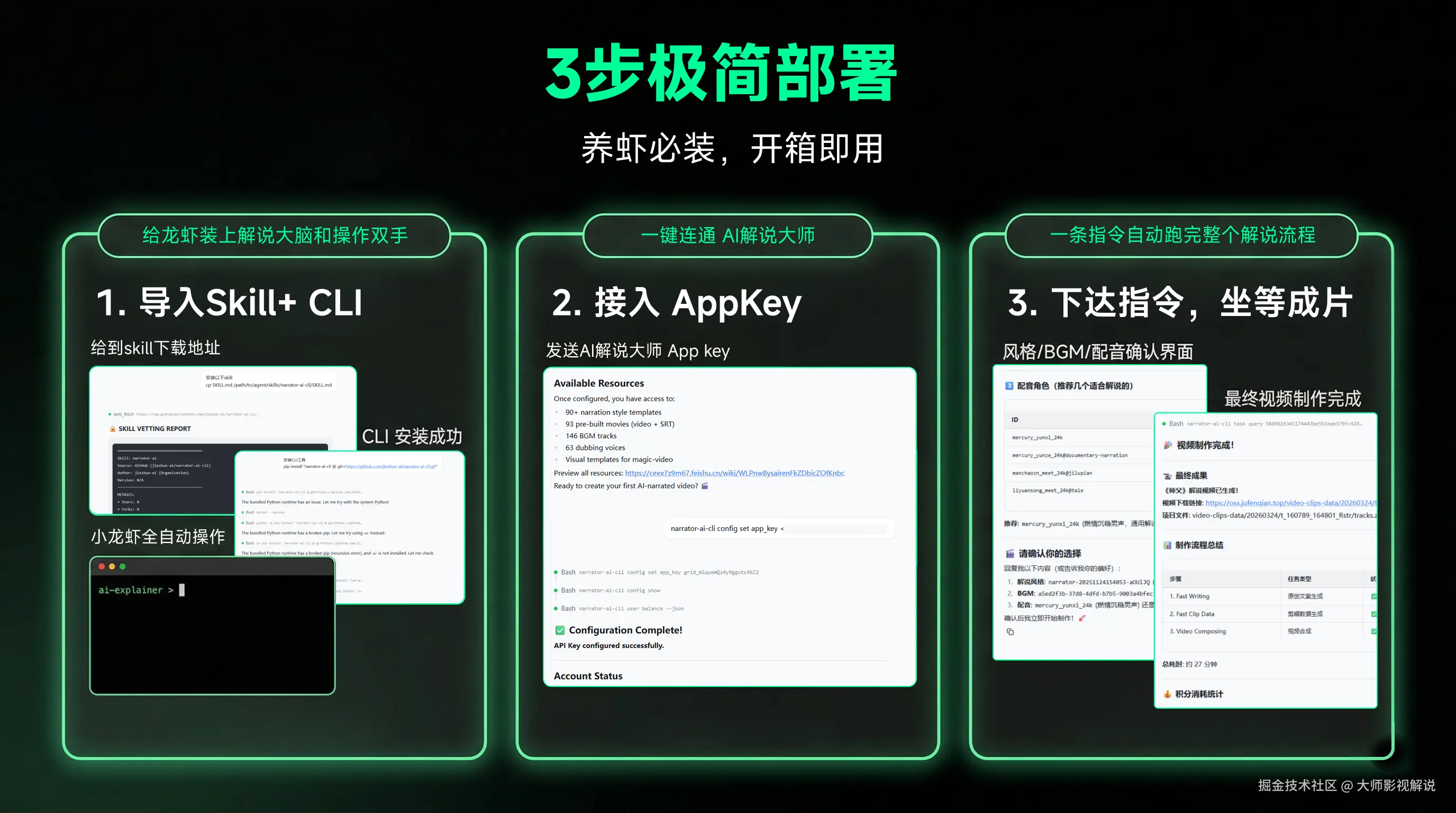 CLI 是"操作双手" ——光有经验不行,还得能干活。CLI是一套执行指令,让龙虾能真正调动配音引擎、剪辑引擎、渲染引擎,把文案变成成片。