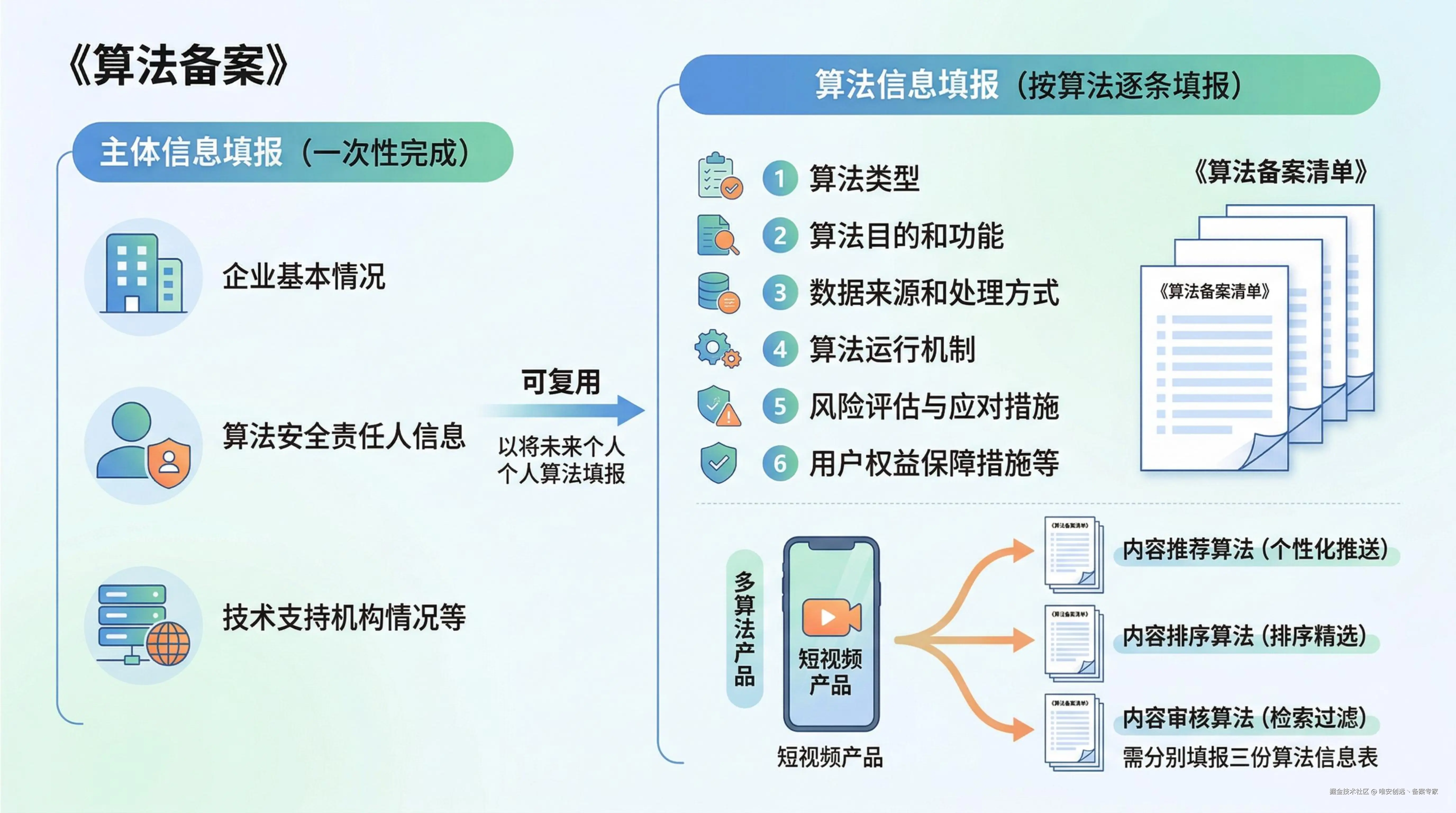 算法信息填报(按算法逐条填报):每个算法需要单独填写一份《算法备案清单》,内容包括算法类型、算法目的和功能、数据来源和处理方式、算法运行机制、风险评估与应对措施、用户权益保障措施等。