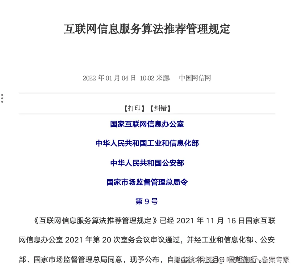 行政法规层面,《互联网信息服务算法推荐管理规定》是算法备案的直接依据。该规定由国家互联网信息办公室于2022年3月1日发布并施行,是全球首部专门规制算法推荐活动的综合性部门规章,具有开创性意义。