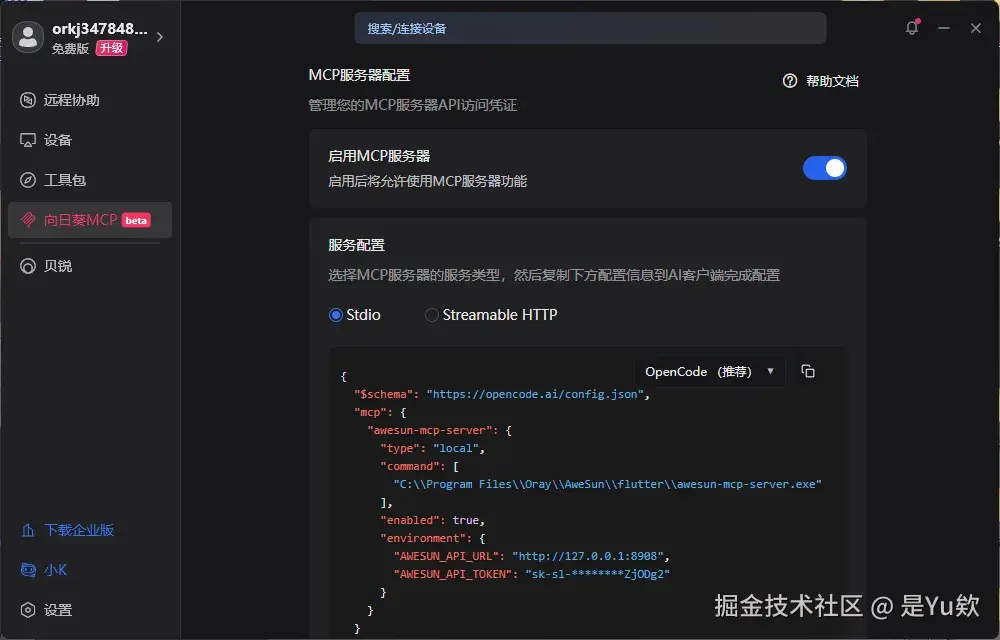 - 打开向日葵客户端,进入「设置」> 「MCP服务器」。点击「启用MCP服务器」