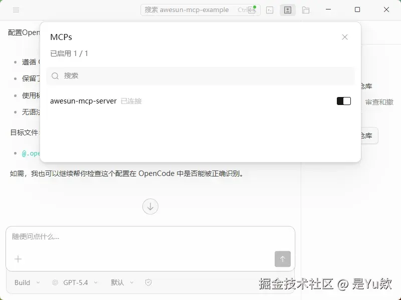 如上所示,如果显示awesun-mcp-server已连接,并且处理开启状态,则配置完成。