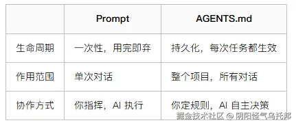 Prompt 是"这次帮我做个什么"。AGENTS.md 是"你在这个项目里应该怎么工作"。