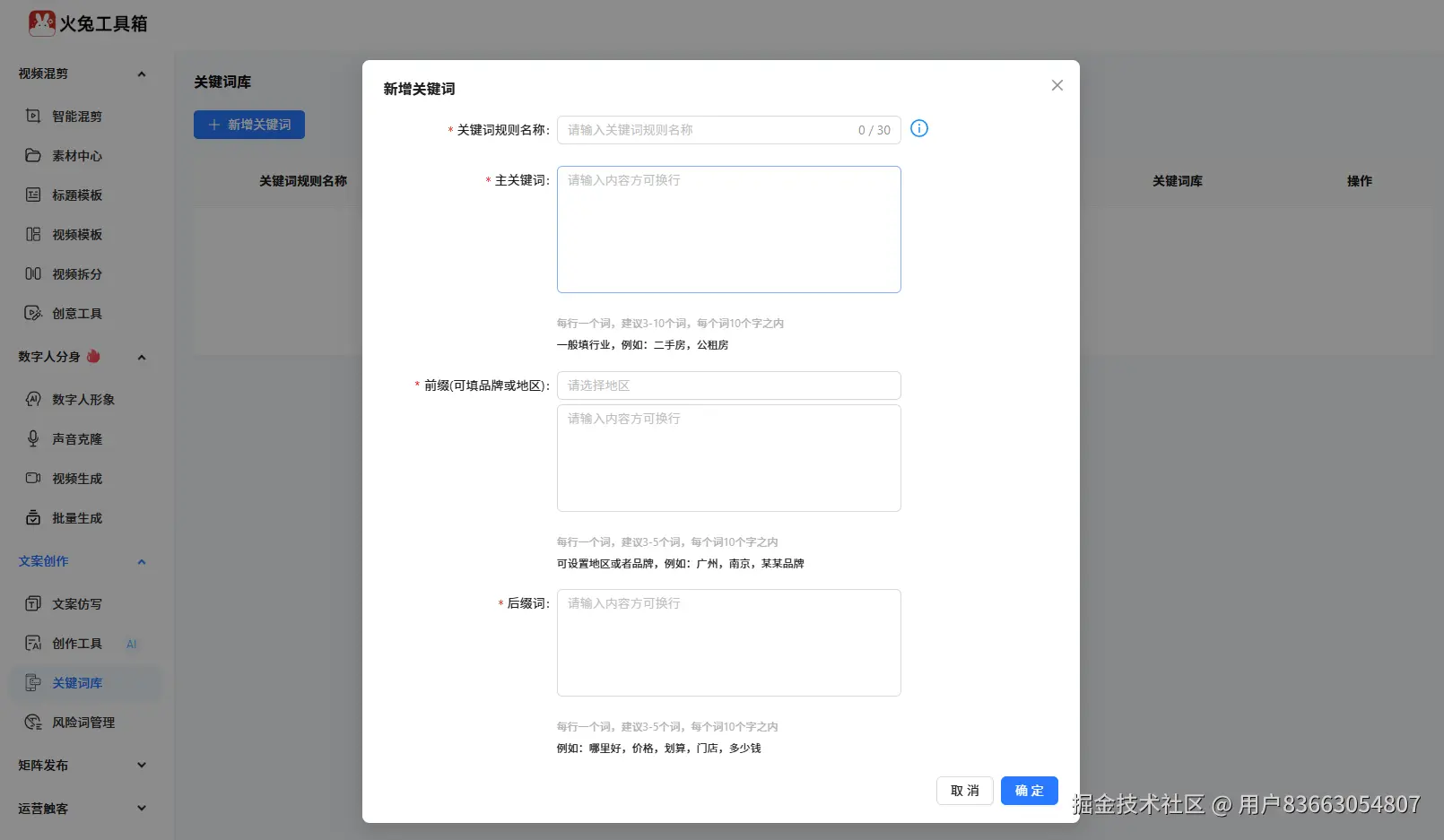 除此之外,火兔工具箱还内置了关键词库和风险词管理功能,做美蛙鱼头视频时,输入“美蛙鱼头”“现杀现做”“入味脱骨”等核心关键词,能提升视频曝光量,同时避开餐饮行业的违规词,避免视频被限流,这对于新手来说真的太重要了。
