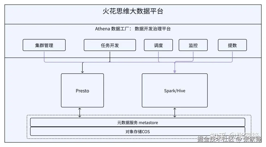 上层: 自研大数据平台Athena,承载着集群管理、任务开发、调度编排、运行监控和数据提取等核心功能。这是业务人员日常操作的统一入口,也是我们多年来沉淀的核心技术资产。