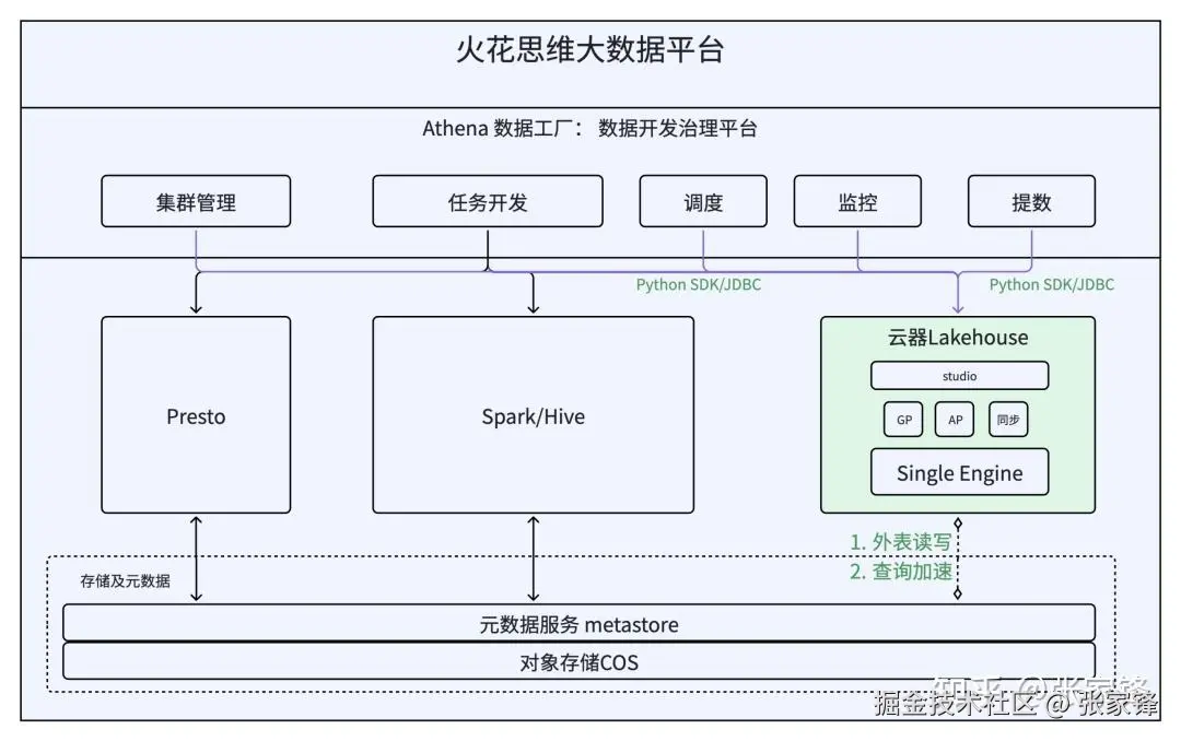 从升级后的架构图可以看到,平台通过Python SDK/JDBC接口,将原本发往spark的任务分流到新的Lakehouse引擎。新引擎以"外表模式"直接读写COS中的数据,与原有Spark/Hive形成互补。
