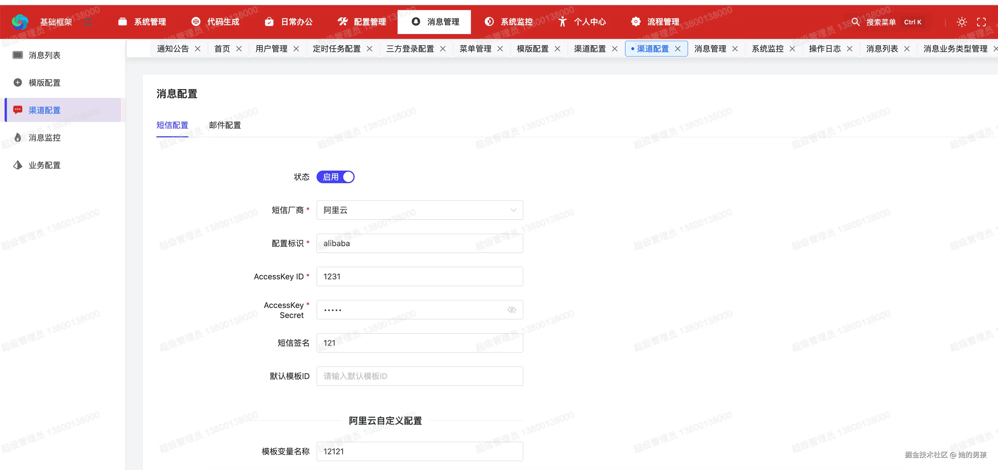 这次更新主要是完善了消息管理模块,整合了 sms4j 短信框架和邮件服务,增加了可视化配置和完整的消息监控,让消息管理变得更简单。
