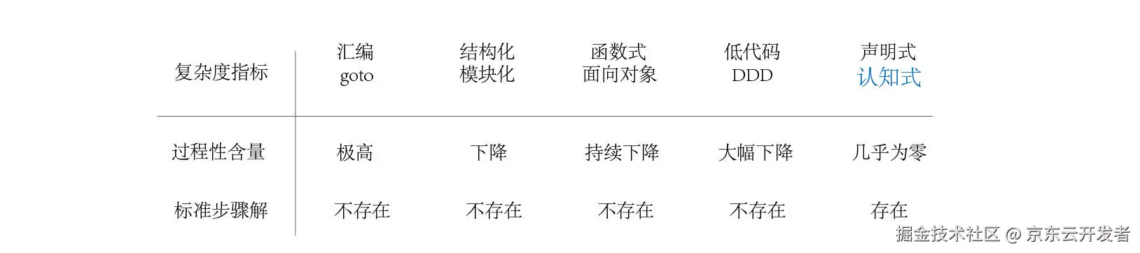 认知式第一次把流程编排归化为标准解步骤,达成与声明式一样效果:只需描述结果,实现过程完全交给系统框架。而它们的区别是,声明式是特定领域,而认知式是通用业务域。