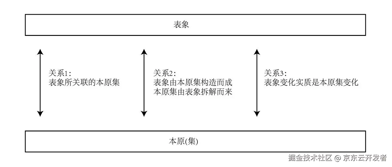 表象与本原参考了聚合根与实体,但表象与本原的关系更着重于对现象的更深层的思考和挖掘到的本质:用更少的本质规律决议更宽广的现象空间。