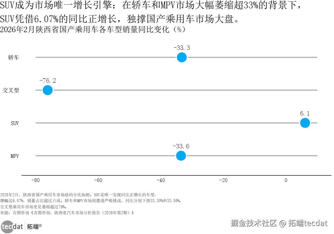 2026年2月,陕西省国产乘用车市场结构分化加剧。SUV是唯一实现同比正增长的车型,增幅达6.07%,销量占比超过六成。轿车和 MPV **市场则遭遇严峻挑战,同比分别下滑33.30%和33.56%,交叉型乘用车市场更是萎缩超过76%。