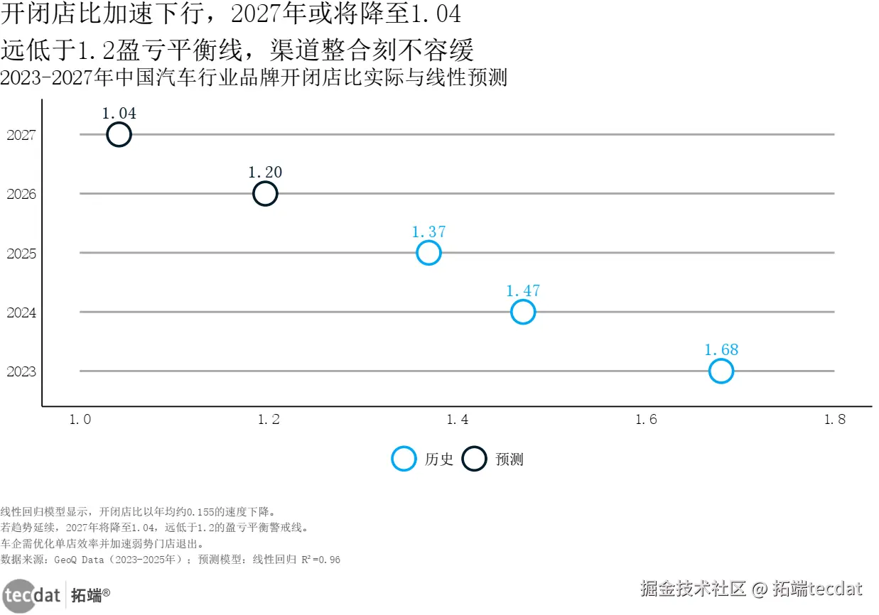 线性 **回归模型显示,开闭店比以年均约0.155的速度下降。若趋势延续,2027年将降至1.04,远低于1.2的盈亏平衡警戒线。车企需优化单店效率并加速弱势门店退出。