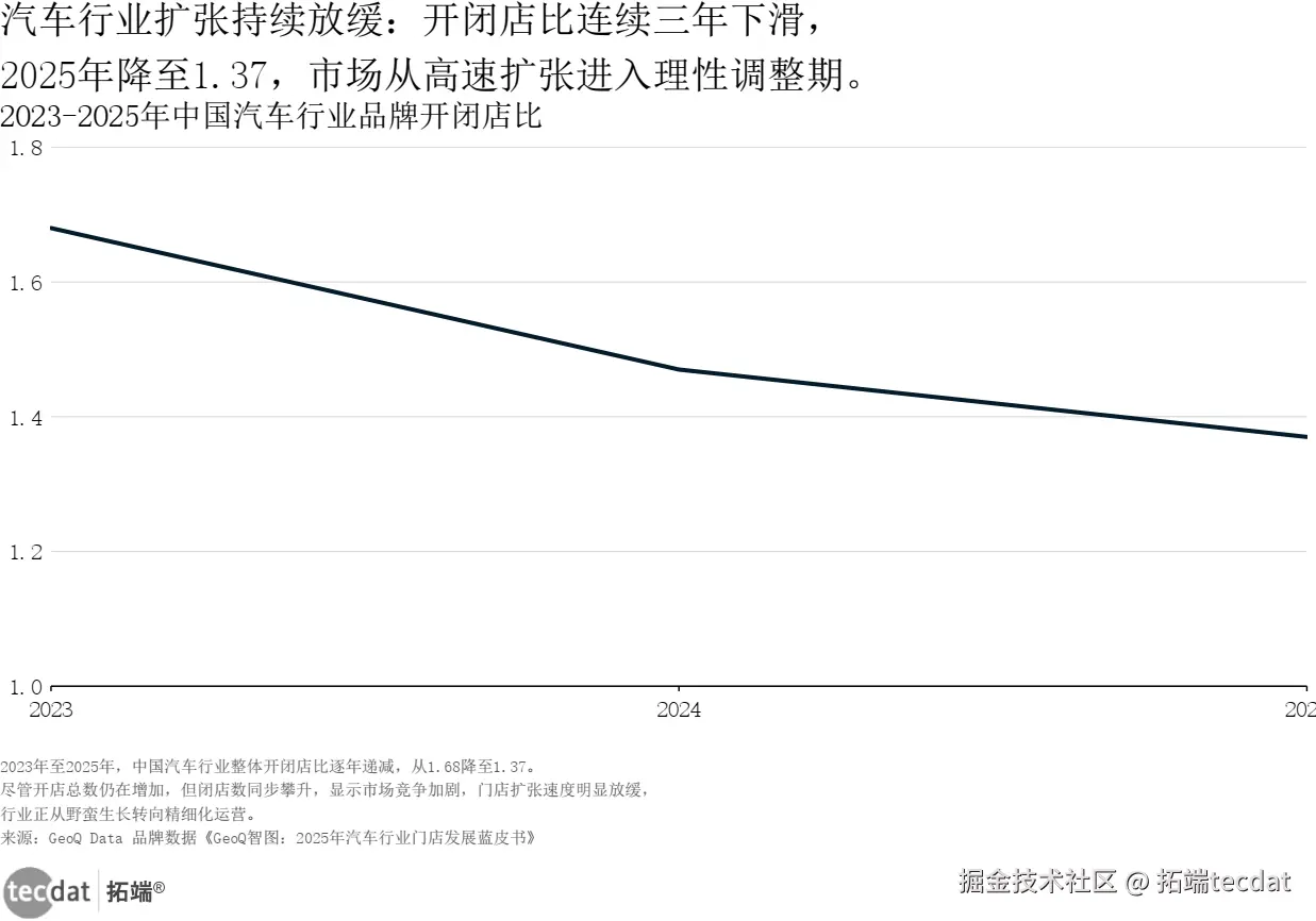 汽车行业扩张持续放缓:开闭店比连续三年下滑,2025年降至1.37,市场从高速扩张进入理性调整期。