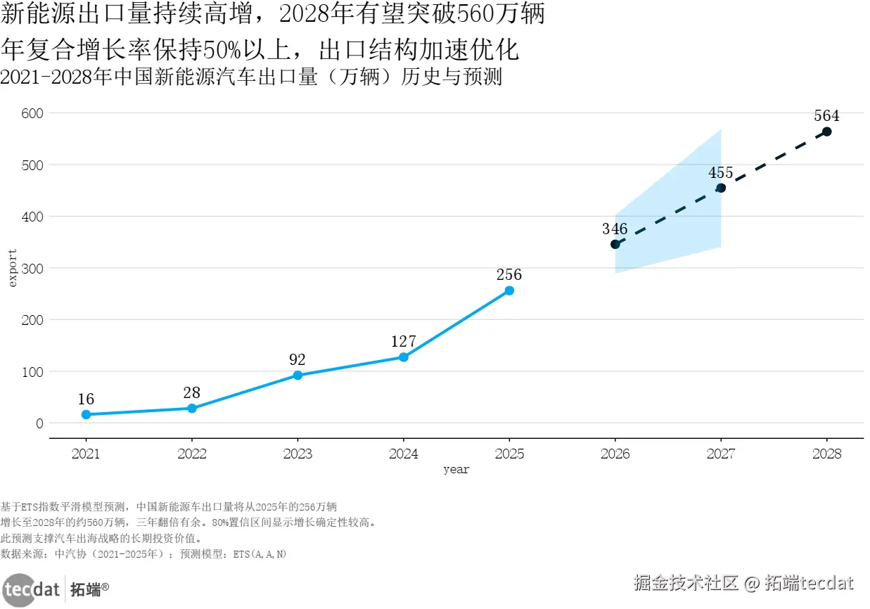 基于ETS指数平滑 模型 **预测,中国新能源车出口量将从2025年的256万辆增长至2028年的约560万辆,三年翻倍有余。80%置信区间显示增长确定性较高。此预测支撑汽车出海战略的长期投资价值。